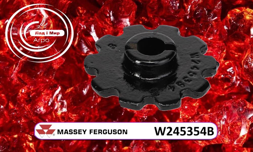 Зірочка W245354B до FENDT, Challenger, MF, Agco Parts Massey Ferguson Limited крупний американьский виробник сільхозтехніки та обладнання. Входе до компанії AGCO. В даний час Massey Ferguson - це тільки назва бренду, що використовується AGCO, але техніка Massey Ferguson залишається найбільш широко продається в усьому світі, а популяція функціонуючих тракторів під цим брендом налічує більше 5,2 мільйонів. Ви можете замовити агрозапчастини Зірочка W245354B до FENDT, Challenger, MF, Agco Parts від на нашому сайті ladimiragro.com.ua. Якщо у Вас виникли додаткові запитання по запчастині Зірочка W245354B до FENDT, Challenger, MF, Agco Parts. Ви можете зателефонувати за телефонними номерами. Всі номери вказані на сайті ladimiragro.com.ua. Наші фахівці мають великий досвід. Вони нададуть всю вичерпну інформацію на агрозапчастини до техніки John Deere. Також в разі випадку, запропонують альтернативу. Це можуть бути інші агрозапчастини до сільгосптехніки таких відомих виробників як John Deere, Claas,  New Holland, Challenger, Fendt, Great Plains, Horsch, Case, Kinze, Massey Ferguson. Компанія "Лад і Мир агро" - це Ваш надійний партнер. Ми зробимо все можливе і неможливе. Ми якомога швидко доставимо до Вас Зірочка W245354B до FENDT, Challenger, MF, Agco Parts в найкоротший термін. Ми співпрацюємо з усіма перевізниками по всій Україні. Переглянути інші товари виробника Massey Ferguson  на нашому сайті. Лад і Мир Вашому господарству! Компанія «Лад і Мир Агро» є надійним партнером для сільськогосподарського виробника для замовлення оригінальної запчастини на сільськогосподарську техніку. Головним принципом є надання професійної підтримки і забезпечення потреб в запасних частинах для агротехніки для кожного клієнта нашої компанії. У нас ви можете замовити оригінальні агрозапчастини від таких відомих виробників, як Claas, Challenger, Fendt, Great Plains, Horsch, John Deere, Kinze, Massey Ferguson та інших. Для цього можете перейти до нашого каталогу – агрозапчастини Команда «Лад і мир агро» - це надійний партнер, який пройде з Вами шлях протягом усього періоду експлуатації, забеспечуючи якісне постачання запасних частин для імпортної техніки.