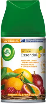 Змінний аерозольний балон для автоматичного освіжувача повітря серії Air Wick Freshmatic з ароматом «Тропічні фрукти & солодкий мандарин». Призначений для регулярного автоматичного розпилення аромату у кімнатах, підтримуючи свіжість і комфорт в приміщенні без необхідності ручного застосування.