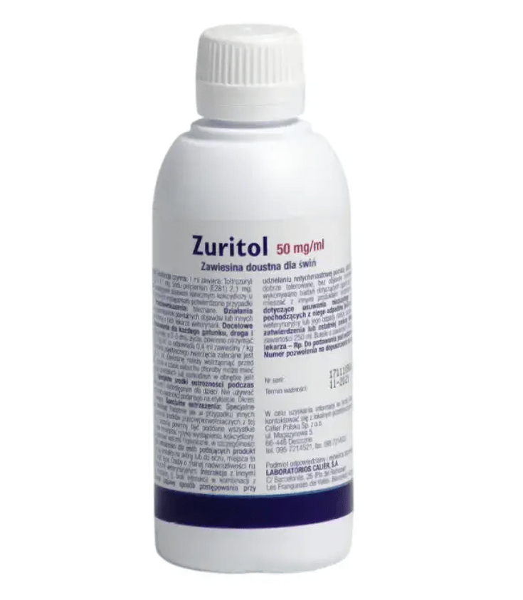 Зуритол 5% призначають поросям із лікувальною і профілактичною метою одноразово на 3-5 день життя в дозі 20 мг толтразурілу на 1 кг маси тварини. Препарат вводять тваринам перорально індивідуально за допомогою спеціального дозатора з розрахунку 0,4 мл суспензії на 1 кг маси тварини, але не менш ніж 0,5 мл і не більш ніж 2 мл на тварину. Перед застосуванням ємність із зважуванням треба ретельно збовтати.