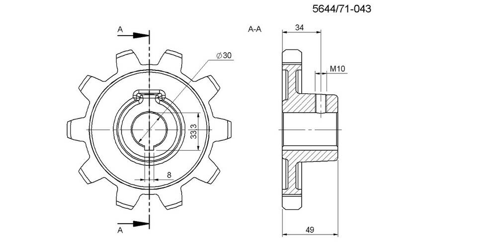 Звездочка приводная выгрузного транспортера бункера 10 зубов (под шпонку) для картофелеуборочного комбайна ANNA Z-644