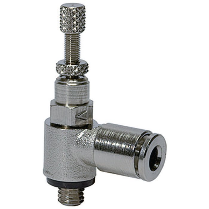 For fine regulation of a cylinder piston speed in the forward and return motion and precise control of flow rates. Designed as a banjo-type valve with a hollow bolt and ring piece. Can be screwed directly onto the valve or cylinder. Compact type of construction, also ideal where space is restricted. On the version with a knurled screw, the set volumetric flow rate can be locked with the hexagon nut to obtain a fixed setting.