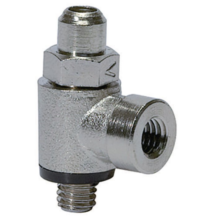 For fine regulation of a cylinder piston speed in the forward and return motion and precise control of flow rates. Designed as a banjo-type valve with a hollow bolt and ring piece. Can be screwed directly onto the valve or cylinder to restrict the incoming air. Compact type of construction, also ideal where space is restricted.