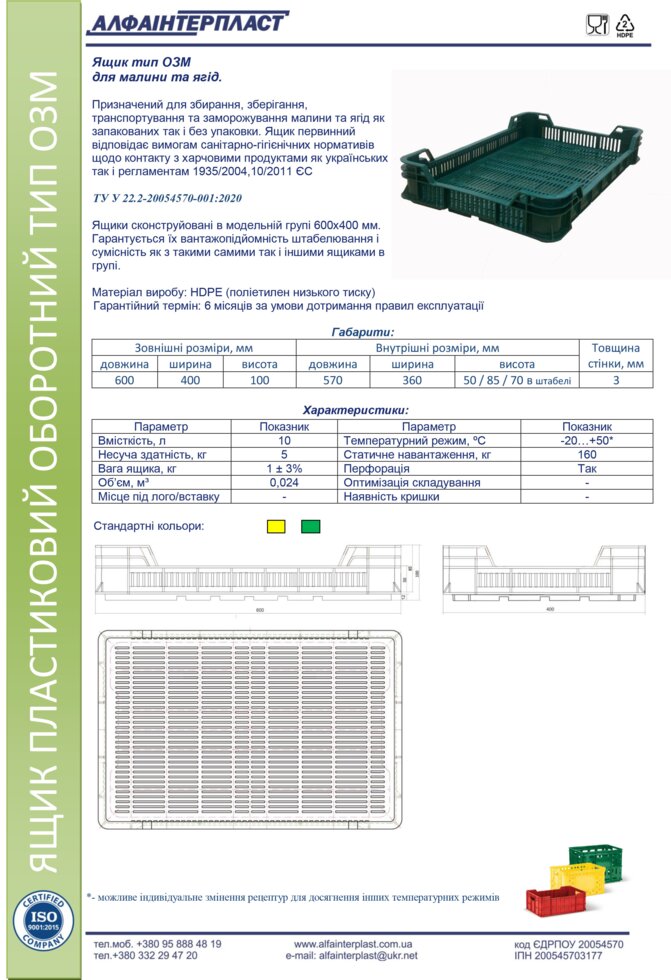 Ящики изготовлены из полиэтилена низкого давления. Они прочные, износоустойчивые, легко моются, и в отличие от картонных или деревянных ящиков, пригодные к многоразовому использованию.