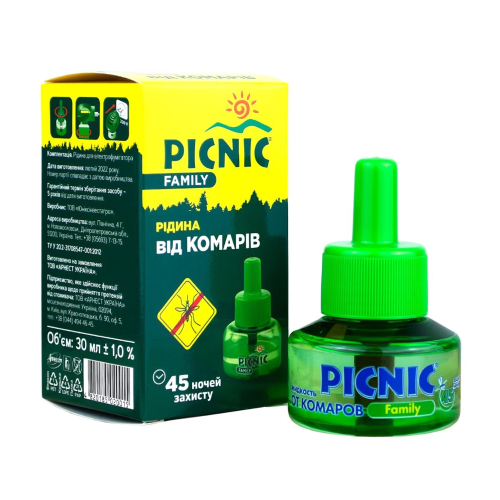 Жидкость от комаров для электрофумигаторов PICNIC Family 45 ночей 30 мл – это универсальное средство, призванное защитить ваш дом от нежелательных гостей. Принцип работы построен на точно подобранном соотношении активных химических препаратов и натуральных растительных эфирных масел. Такой подход к проблеме борьбы с летающими кровососущими насекомыми позволяет не только успешно справляться с их уничтожением, но и обеспечивает заботу о детях и людях с чувствительной кожей, минимизируя негативное воздействие от использования фумигатора. Защищает от всех видов летающих кровососущих насекомых. Подходит для всех членов семьи, для взрослых и детей с 5 лет.